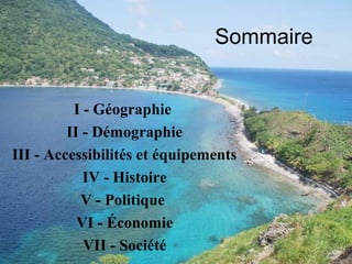 La Dominique est une île volcanique des Caraïbes, connue pour sa géographie montagneuse et ses riches ressources naturelles, incluant 365 rivières. Avec une population de 68 000 habitants, elle a une histoire coloniale complexe mais a obtenu son indépendance en 1978. L'économie, principalement basée sur l'agriculture et le tourisme, fait face à des défis tels qu'une dette publique élevée et un commerce extérieur déficitaire.