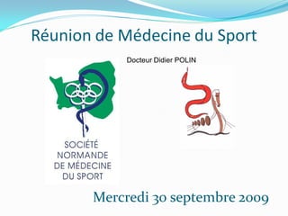 La réunion de médecine du sport du 30 septembre 2009 menée par le Dr Didier Polin aborde l'évolution du dopage dans le sport, les performances physiologiques et les défis liés au contrôle antidopage. Des études sur le VO2 max et les performances des athlètes, tels que Lance Armstrong et Alberto Contador, sont présentées, mettant en lumière les méthodes de dopage modernes. Le document soulève des préoccupations sur l'efficacité des stratégies antidopage et l'intégrité du sport face à la mondialisation et à la commercialisation.