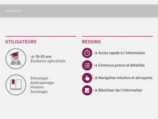 Le document traite d'un bas-relief de 1931 au Palais de la Porte Dorée, illustrant les richesses des colonies françaises. Il met en lumière les besoins des utilisateurs, en particulier des étudiants âgés de 18 à 25 ans, pour un accès rapide et intuitif à des contenus sur l'ethnologie et l'histoire. Une stratégie est proposée pour explorer les influences culturelles entre la France et ses anciennes colonies à travers des dispositifs interactifs et des applications.