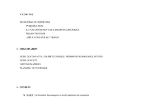 Le document présente un projet de reportage sur la formation des managers éthiques et responsables dans les écoles de commerce, en se basant sur l'ouvrage de Florence Noiville. L'équipe explore comment ces établissements tentent de répondre aux enjeux sociaux et environnementaux actuels. À travers des interviews et des réflexions, le reportage vise à mettre en lumière le rôle des écoles de commerce dans le changement de leur image et de leurs enseignements.