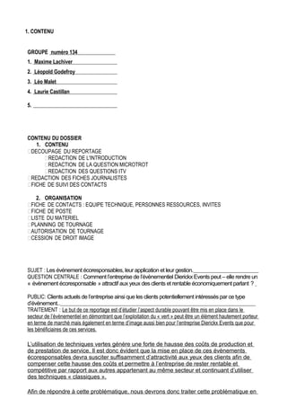 Le document traite de l'organisation d'un reportage axé sur l'événementiel écoresponsable, en particulier sur les stratégies de l'entreprise Dierickx Events pour rendre ces événements attractifs et rentables. Il aborde les défis liés au surcoût des pratiques durables et leur acceptation par les clients, ainsi que l'importance croissante de l'écoresponsabilité dans le secteur. Le reportage inclura des interviews et des analyses pour démontrer les avantages économiques et d'image des événements verts.