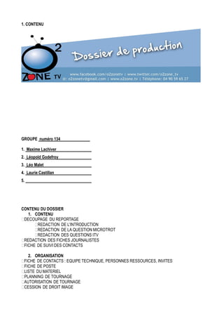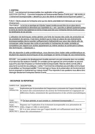 Le document présente un projet de reportage sur l'événementiel écoresponsable, visant à étudier comment Dierickx Events peut rendre ses événements à la fois attractifs et rentables. Il aborde les enjeux du développement durable dans le secteur et les défis liés à l'acceptation des coûts additionnels par les clients. Le reportage inclut des interviews, des séquences de micro-trottoirs et une analyse des pratiques traditionnelles par rapport aux méthodes écoresponsables.