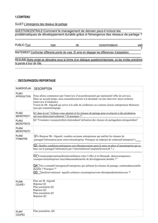 Le document présente un projet de reportage sur l'émergence des réseaux de partage et leur impact sur le management durable. Il inclut des interviews avec un entrepreneur et des étudiants, ainsi qu'un plan détaillé pour l'organisation, le matériel et le planning de tournage. L'objectif est de confronter différentes perspectives et de dégager des tendances sur l'utilisation des réseaux de partage dans notre quotidien.
