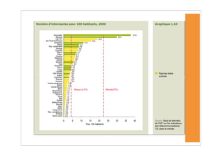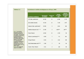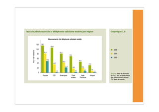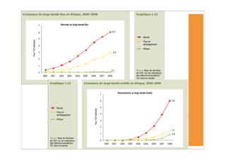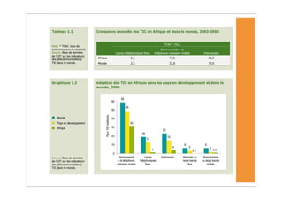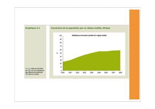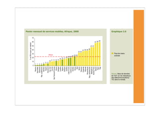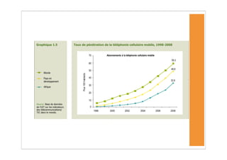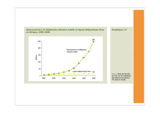 L'Afrique a connu une forte augmentation des abonnements à la téléphonie mobile, atteignant 246 millions fin 2008, mais les taux de pénétration d'Internet restent très bas. Malgré la croissance des TIC, des défis persistent, notamment en matière d'infrastructure et de coût, rendant difficile l'accès à ces technologies pour les populations à faible revenu. Les services mobiles, tels que les services bancaires, se développent rapidement, mais la durabilité de cette croissance est menacée par des obstacles économiques et réglementaires.
