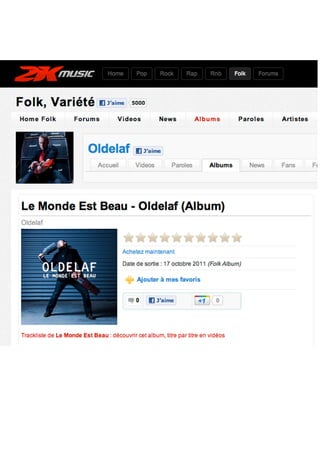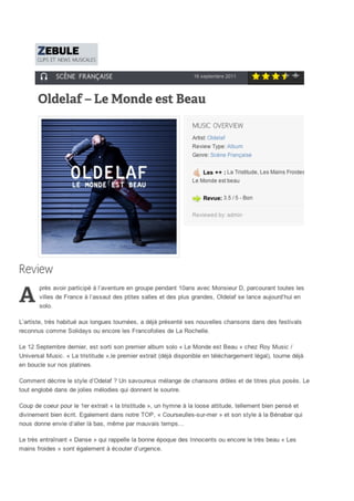 Oldelaf, après la séparation de son groupe Oldelaf et Monsieur D, revient en solo avec son album "Le Monde est Beau", prévu pour octobre 2011. Cet album combine humour et émotion, avec des textes intelligents qui portent un regard critique sur le quotidien et les travers des réseaux sociaux. Oldelaf aspire à une plus grande liberté artistique, permettant d'inclure des éléments plus personnels dans sa musique.