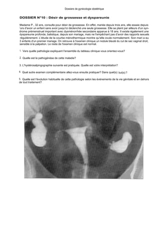Le document aborde le cas clinique d'une femme de 32 ans ayant un désir de grossesse mais souffrant de dyspareunie et d'un syndrome prémenstruel. Il examine la pathogénèse potentielle de l'endométriose, les résultats d'une hystérosalpingographie, et propose des examens complémentaires tels que la coelioscopie pour confirmer le diagnostic et évaluer l'étendue des lésions. L'évolution de cette pathologie est décrite comme chronique, apparaissant après la puberté et s'améliorant généralement avec la grossesse, pour disparaître à la ménopause.