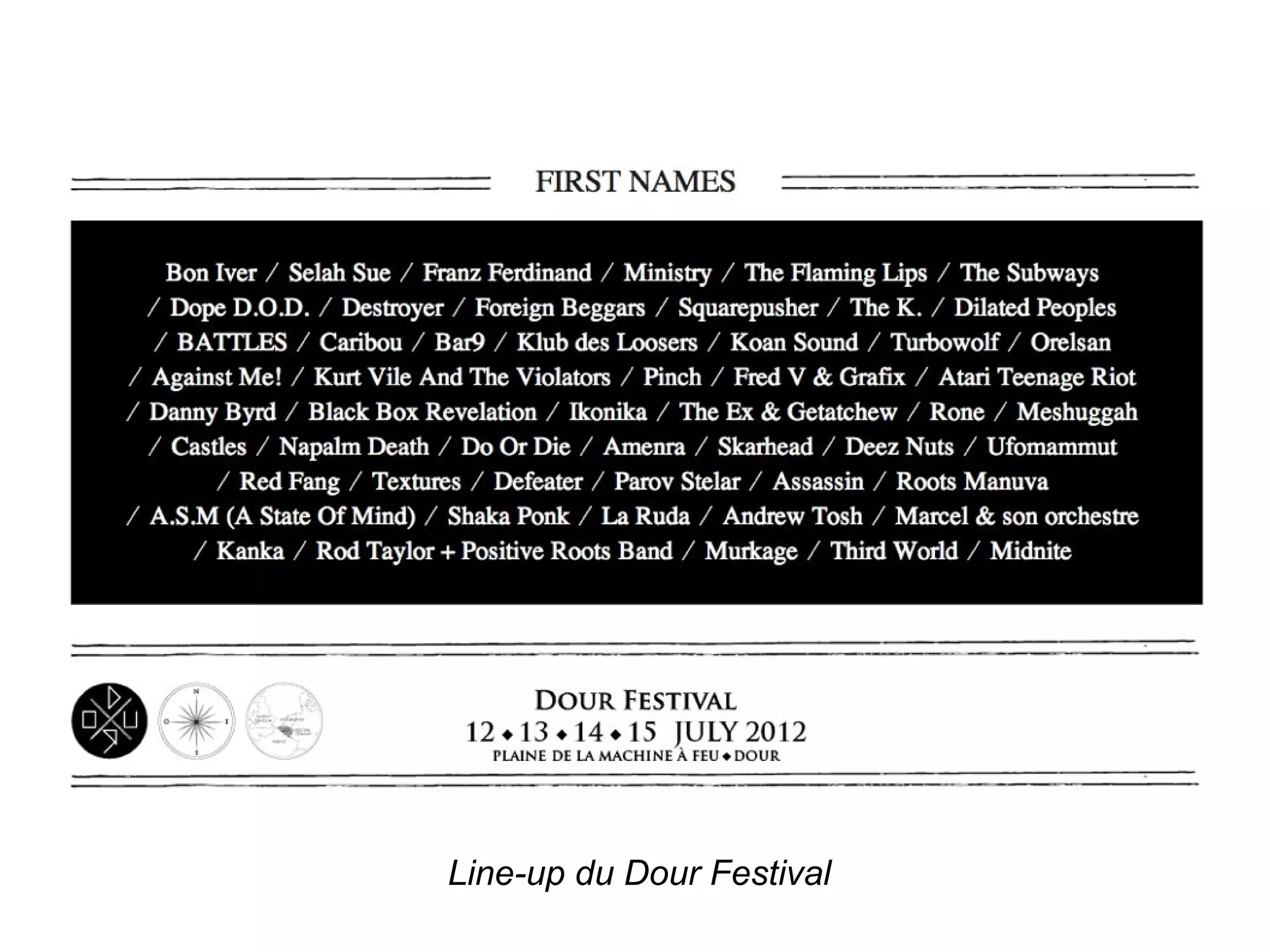 Le document décrit le camping et l'organisation du festival Dour. Il mentionne des éléments visuels tels que des fosses lors des concerts et des affiches. Le Dour Festival est un événement musical important.