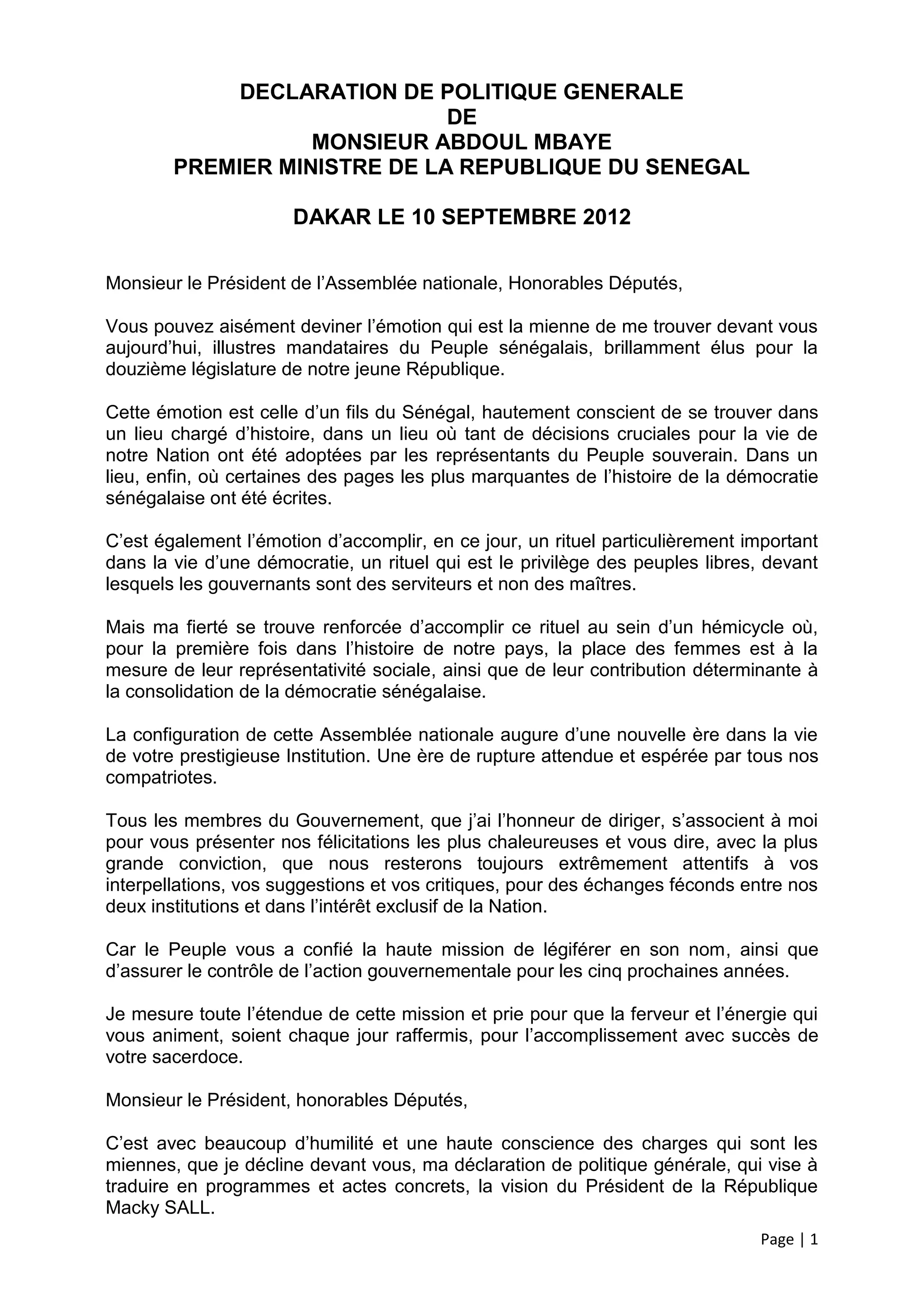 Monsieur Abdoul Mbaye, Premier ministre du Sénégal, présente une déclaration de politique générale insistant sur l'importance d'une nouvelle ère politique et sociale pour le pays, marquée par une représentation accrue des femmes et une volonté de changement face à des défis économiques et sociaux. Il évoque la vision du président Macky Sall, axée sur l'émergence d'une société solidaire et respectueuse des valeurs démocratiques, tout en reconnaissant les défis persistants tels que la vulnérabilité économique, les inégalités, et les besoins croissants en matière d'infrastructures, de santé et d'éducation. Le discours souligne l'urgence d'actions concrètes pour satisfaire les attentes du peuple sénégalais et améliorer les conditions de vie des citoyens.