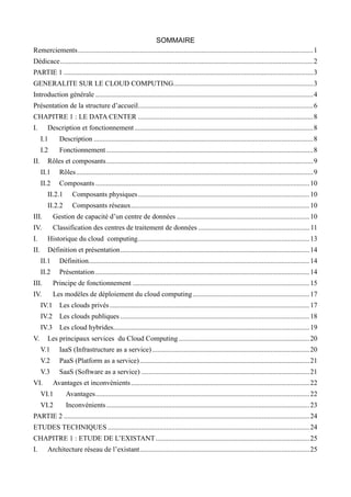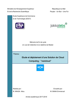 Ce document présente un mémoire de fin de cycle pour un master, axé sur l'étude et le déploiement de la solution de cloud computing Nextcloud. Il traite de divers aspects du cloud computing, y compris son fonctionnement, ses avantages et inconvénients, ainsi que des études techniques sur son déploiement. En outre, le mémoire aborde l'importance des datacenters et la structure d'accueil Jokkolabs qui soutient les entrepreneurs dans le développement de leur activité.