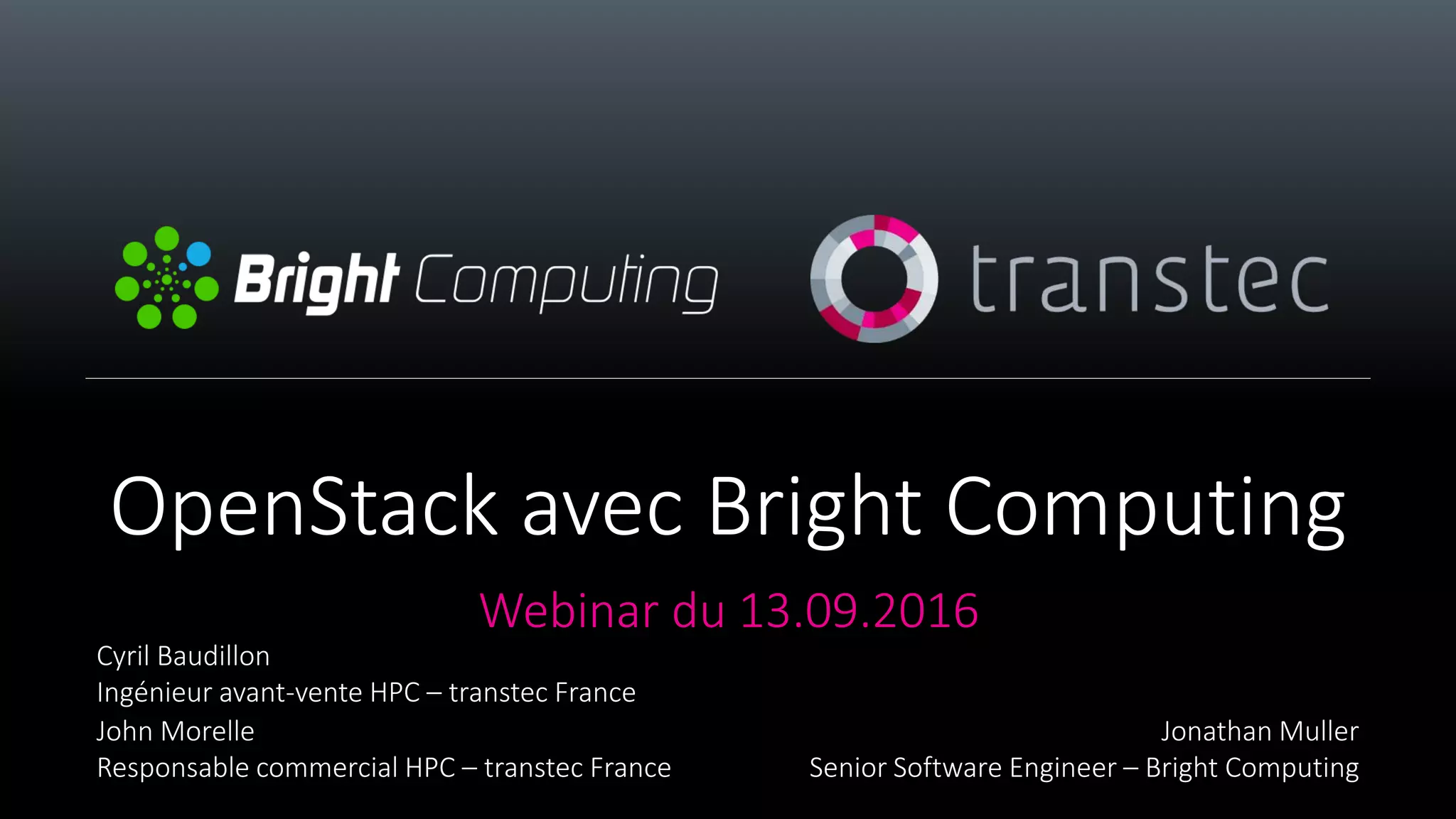 Le webinar a présenté les solutions de Transtec et Bright Computing mettant en avant l'architecture de Bright OpenStack et ses démonstrations, axées sur la gestion des infrastructures HPC. Transtec, avec plus de 30 ans d'expérience, propose des solutions pour des clients dans l'industrie et la recherche, tandis que Bright Computing se spécialise dans la gestion de clusters. Les deux entreprises confluent sur l'utilisation d'OpenStack pour des solutions cloud et de haute performance.