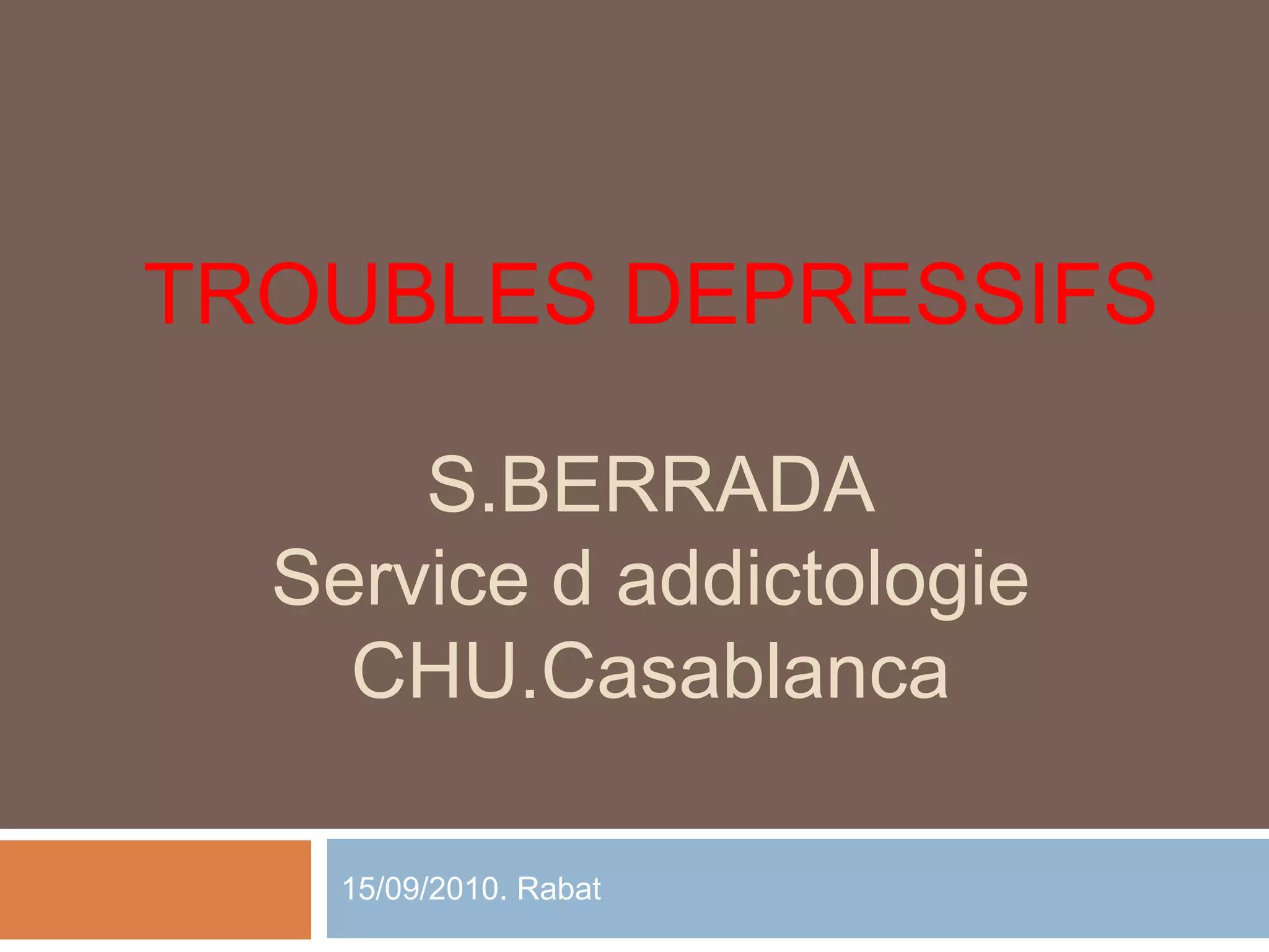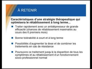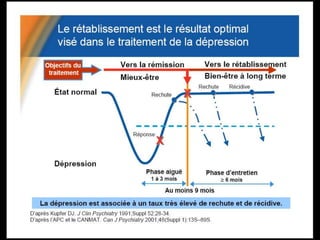 La dépression est un problème de santé publique majeur, touchant 340 millions de personnes dans le monde et préfigurant des conséquences graves comme le suicide. Un faible taux de détection et de traitement des cas dépressifs en médecine générale met en lumière l'importance d'une meilleure identification et prise en charge des patients. Le document aborde les symptômes, les critères diagnostiques et les traitements, tout en soulignant le rôle des neurotransmetteurs dans la dépression.
