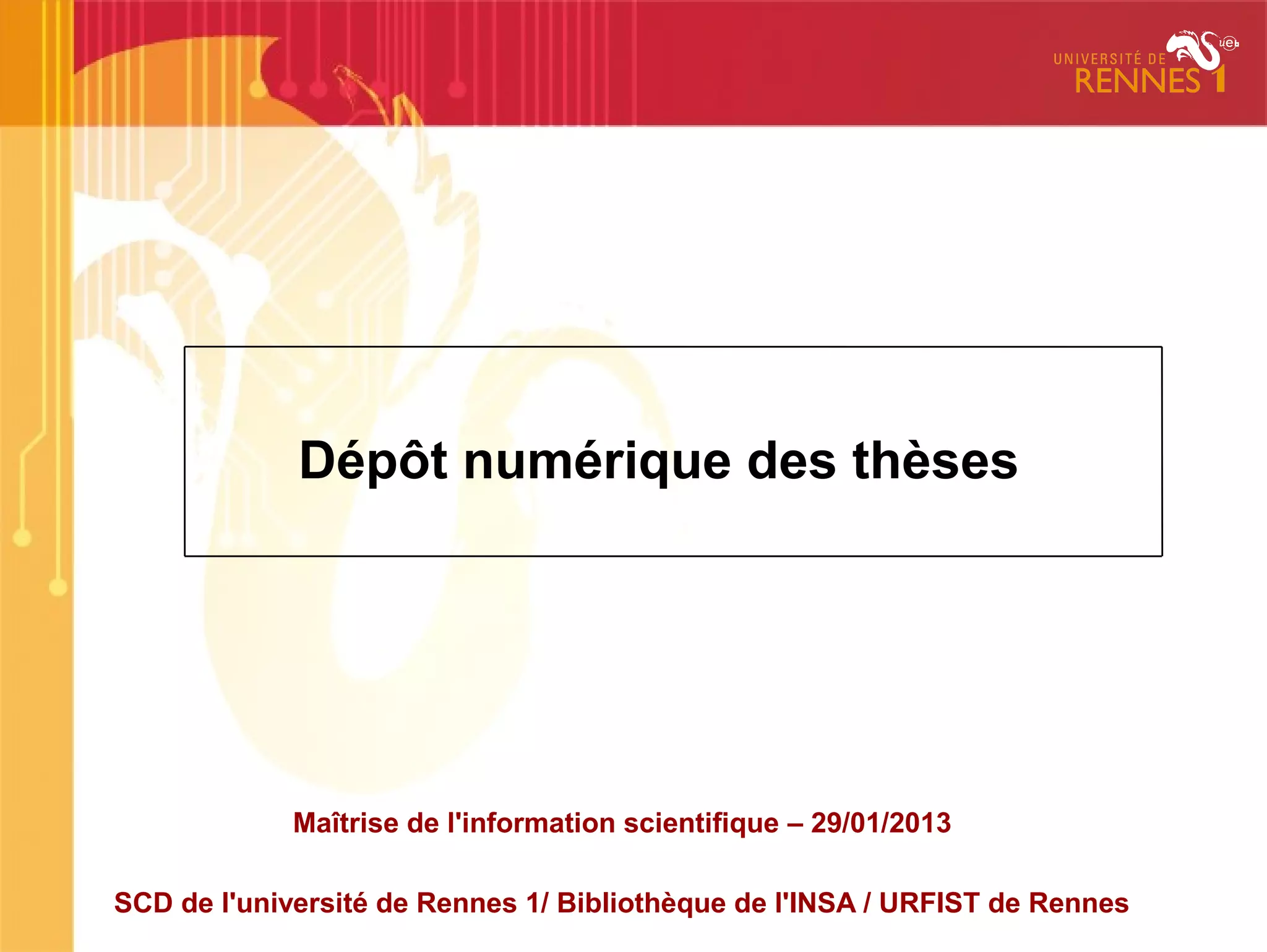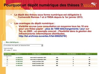 Le dépôt numérique des thèses à l'Université de Rennes 1 et à l'INSA est devenu obligatoire depuis le 1er janvier 2013, offrant des avantages tels qu'une visibilité accrue et une valorisation des travaux de recherche. Il est important de respecter les droits d'auteur et d'effectuer des dépôts de thèses en conformité avec les obligations légales, notamment en obtenant les autorisations nécessaires pour les contenus non libres de droit. La procédure de dépôt comprend des étapes spécifiques avant et après la soutenance, ainsi que des considération pour les thèses confidentielles.