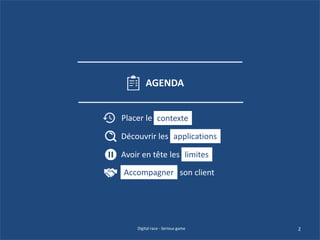 Le document explore l'évolution et l'impact des serious games, qui sont définis comme des jeux dont l'objectif principal va au-delà du simple divertissement, et examine leur utilisation dans divers domaines tels que la formation, le marketing et la conduite du changement. Il présente également des chiffres sur le marché mondial des serious games et souligne l'importance de la conception adaptée pour garantir leur efficacité pédagogique, en tenant compte des différentes limites humaines, pédagogiques et financières. Enfin, des exemples d'applications de serious games dans des contextes éducatifs et professionnels illustrent leur potentiel en tant qu'outil d'apprentissage interactif.