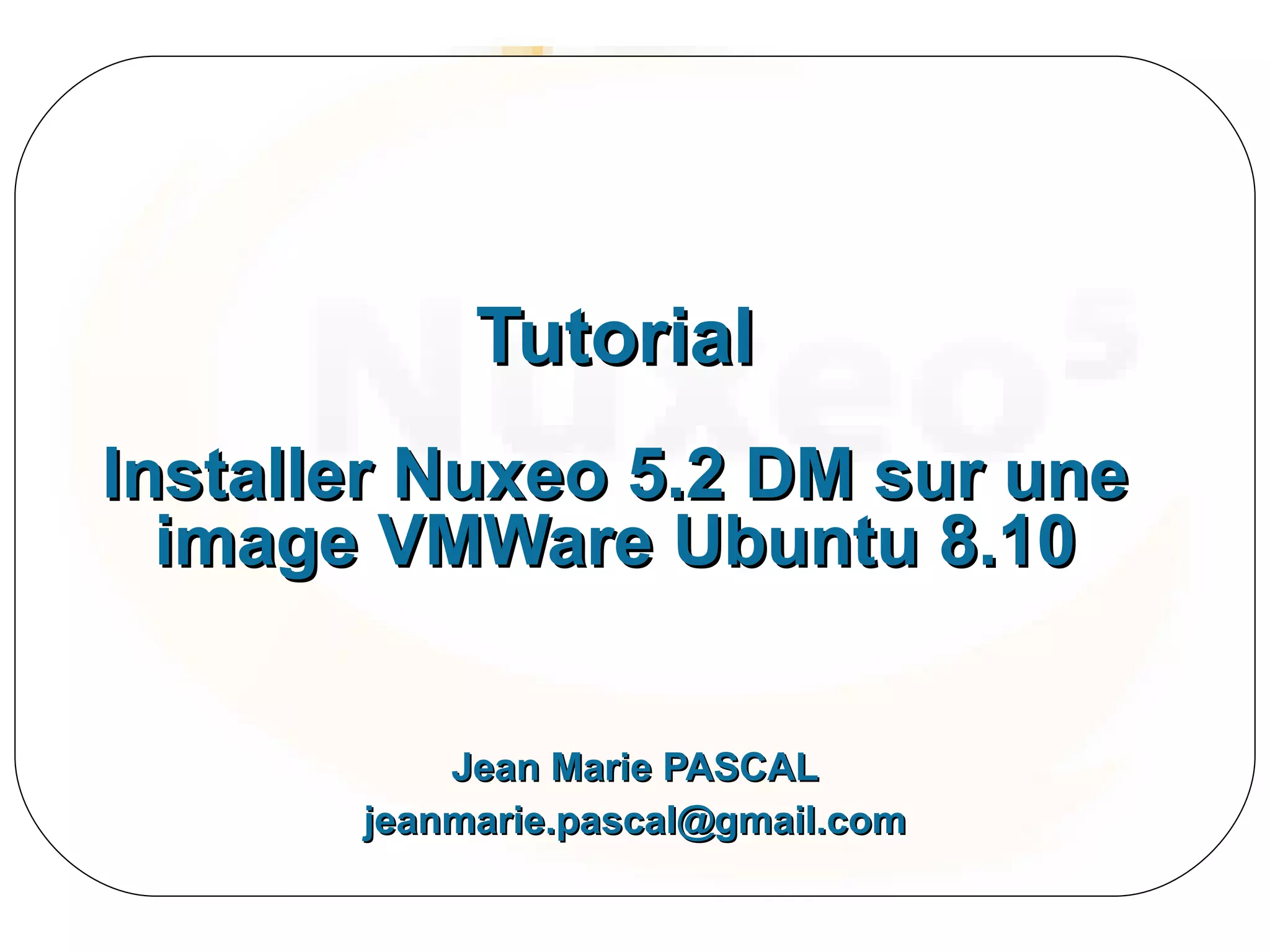 Le document est un tutoriel détaillé sur l'installation de Nuxeo 5.2 DM sur une machine virtuelle Ubuntu 8.10. Il couvre les étapes nécessaires, y compris le téléchargement, l'installation et la configuration des composants nécessaires, tels que PostgreSQL et JBoss. Des instructions spécifiques sont fournies pour établir des connexions SSH, configurer des bases de données et démarrer l'application Nuxeo.