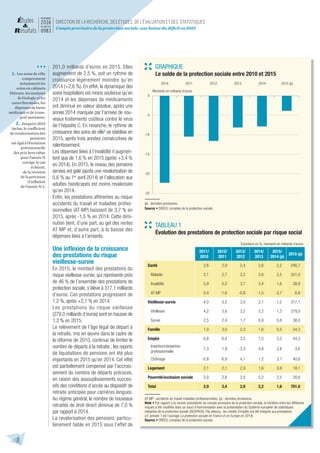En 2015, la France a connu une croissance du PIB de 1,9 % et une réduction significative du déficit de la protection sociale, qui est passé de 7,9 milliards d'euros en 2014 à 3,9 milliards d'euros. Les dépenses de protection sociale ont augmenté de 1,4 %, sous la croissance des ressources de 2,0 %, tandis que les prestations sociales ont représenté 94 % des dépenses totales. Les évolutions sont contrastées selon les risques, avec des hausses plus soutenues dans le risque emploi et des prestations vieillesse et santé en ralentissement.