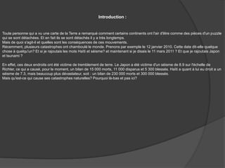 Le document traite de la dérive des continents et des mouvements des plaques tectoniques, qui entraînent des catastrophes naturelles telles que des séismes. Il décrit les différents types de mouvements possibles entre les plaques, comme la divergence, la collision, la subduction et le colisage. En conclusion, la Terre évolue constamment à travers des périodes géologiques, et la géologie permet d'étudier et de comprendre ces changements sur plusieurs millions d'années.