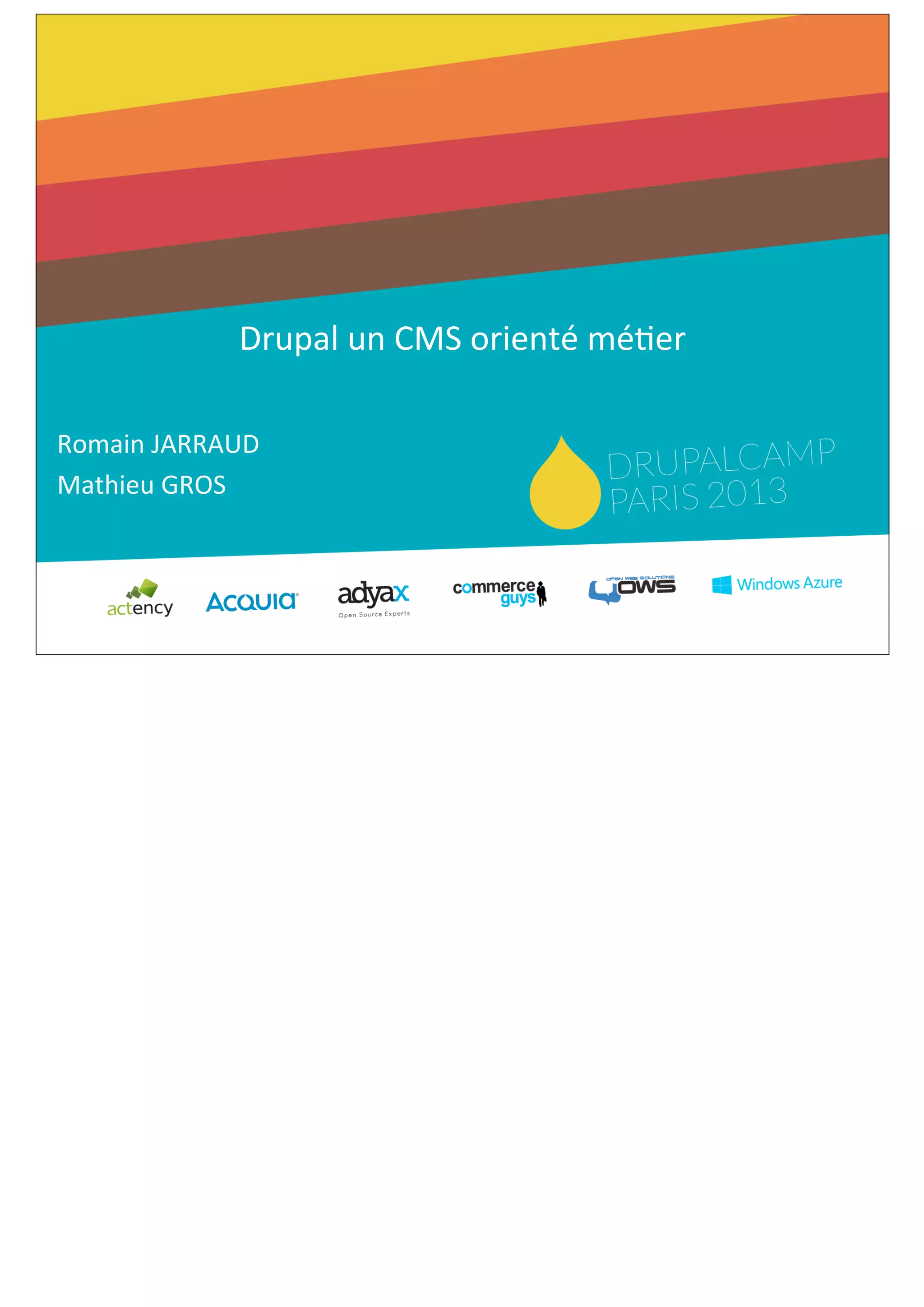 Drupal est un CMS modulaire, reconnu pour son évolutivité et sa sécurité, avec plus de 22 328 modules disponibles et une large adoption par les entreprises, y compris 45 % du CAC40. La version 8 de Drupal, intégrant des améliorations majeures comme Symfony 2 et des fonctionnalités avancées telles que le responsive design et la gestion simplifiée des configurations, marque une nouvelle étape dans son développement. Drupal doit être perçu comme une plateforme de développement plutôt qu'un simple CMS, offrant de nombreuses possibilités d'intégration et de personnalisation.