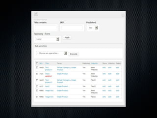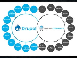 Le document compare les plateformes Drupal et Magento, en mettant en avant les avantages et inconvénients de chacune dans le contexte de projets e-commerce. Il souligne la flexibilité et la puissance de Drupal comme back-office, tandis que Magento est présenté comme un ERP mais souvent limité. L'intégration des deux systèmes est suggérée pour bénéficier des forces de chaque plateforme, notamment pour la gestion de contenu et les fonctionnalités e-commerce.