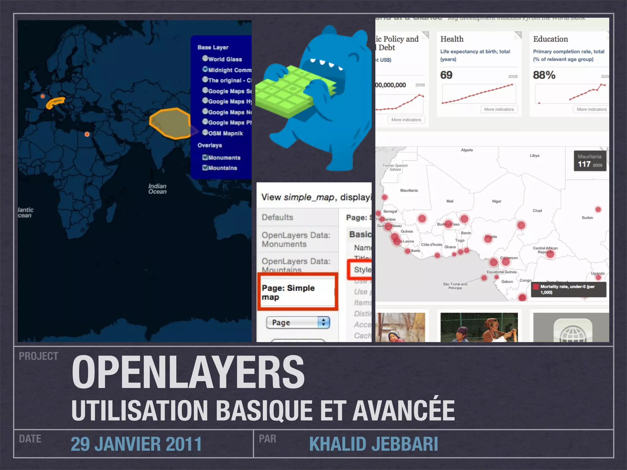 Le document présente l'utilisation de la bibliothèque JavaScript OpenLayers pour la création de cartes interactives et l'affichage de données géographiques. Il explique les fonctionnalités de base et avancées, notamment la gestion des données, la configuration des cartes, et l'intégration avec Drupal. Des exemples d'applications et des liens vers des ressources supplémentaires sont également fournis.