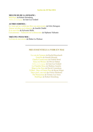 Le document présente un agenda des sorties de films pour le mois de mai 2014, détaillant les films à voir chaque semaine. Les films recommandés incluent 'La voie de l'ennemi', 'Godzilla', 'Grace de Monaco', et 'Adieu au langage'. Il mentionne également d'autres sorties et des films moins recommandés.