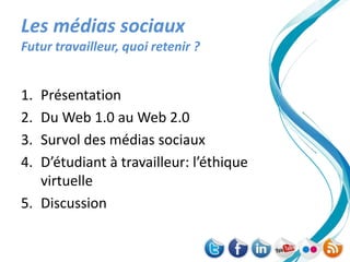 Le document présente une analyse des médias sociaux et leur impact sur le futur des travailleurs, en passant du web 1.0 au web 2.0. Il aborde des thèmes tels que l'éthique virtuelle et l'importance de la gestion des données personnelles sur les plateformes sociales. La présentation, animée par Nicolas Simon, inclut des ressources et des réflexions sur la façon dont les jeunes peuvent naviguer leur identité en ligne de manière responsable.