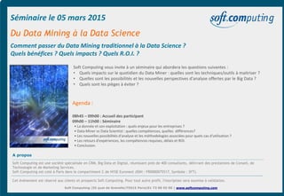 Soft Computing organise un séminaire sur la transition du data mining à la data science, abordant les enjeux, compétences, méthodologies et retours d'expérience liés à cette évolution. L'entreprise, spécialisée en CRM, big data et digital, s'adresse à ses clients et prospects pour discuter des impacts et des opportunités offertes par les nouvelles techniques d'analyse. Le séminaire aura lieu à Paris le 05 mars 2015, et couvre divers aspects liés à l'exploitation des données dans un contexte business.