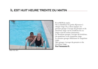 Le document décrit les expériences d'étudiants en stage dans des établissements de soins, où ils assistent des personnes âgées et des enfants. À travers leurs récits, ils partagent des moments marquants et émouvants, illustrant la richesse humaine et les défis du soin, ainsi que des relations touchantes avec les patients. Ces témoignages, accompagnés de photos, montrent l'impact des soins sur les personnes âgées, la vulnérabilité des enfants et l'engagement des stagiaires dans leur apprentissage.