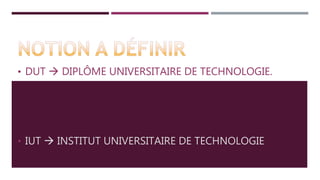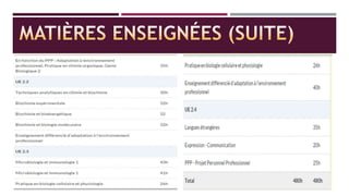 Le document décrit les opportunités de poursuite d'études après un bac STL, notamment à travers un DUT en génie biologique, chimie ou autres spécialités, avec une formation de deux ans. Des options spécifiques et des établissements en Île-de-France sont mentionnés, ainsi que la possibilité de continuer vers une licence professionnelle d'un an. Il présente également les métiers accessibles après un DUT, tels que technicien d'analyse biomédicale et diététicien.