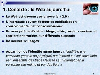 Le document décrit comment développer une présence en ligne dans un contexte de surabondance d'informations et d'évolution des comportements des internautes. Il propose une stratégie de veille, des techniques pour améliorer la visibilité en ligne, ainsi que des conseils pour animer des communautés et gérer les coûts associés. Les bénéfices incluent une meilleure notoriété, une augmentation des ventes et l'importance d'une complémentarité avec le monde physique.