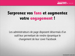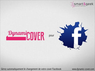 Dynamic Cover est un outil permettant aux administrateurs de pages Facebook de gérer dynamiquement leur photo de couverture avec des fonctionnalités telles que des changements automatiques basés sur des événements, des sondages réactifs, et la mise en avant de fans. Les mises à jour peuvent inclure des flux d'actualités, des vidéos en direct et des compte à rebours. Le service est proposé à un tarif mensuel avec des options gratuites pour les pages de moins de 5000 fans.