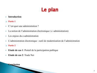 Le document explore la notion d'administration électronique, définie comme l'utilisation des TIC pour améliorer la gestion des affaires publiques, et décrit ses enjeux en termes de modernisation, de transparence et de services à la citoyenneté. Il présente également des études de cas sur le portail de participation publique en Tunisie et le système Tunisie TradeNet, montrant comment ces outils facilitent les démarches administratives et commerciales. En conclusion, le développement de l'administration électronique vise à réduire les coûts publics et à instaurer un management plus participatif et efficace.