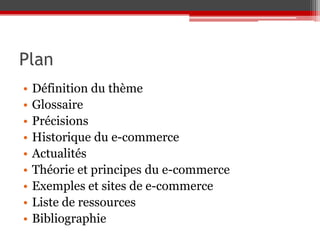Le document traite du commerce électronique (e-commerce), de sa définition, de ses types, ainsi que de son historique et de ses actualités. Il souligne l'évolution et la croissance du e-commerce dans le monde, en incluant des statistiques récentes sur les achats en ligne. De plus, il présente des exemples de sites e-commerce et une liste de ressources pour en apprendre davantage sur le sujet.
