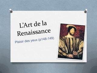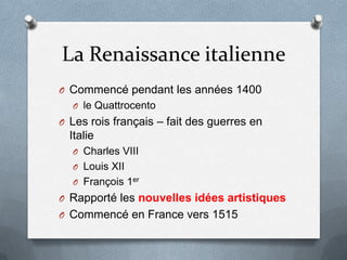 La renaissance italienne a débuté au 15ème siècle en Italie et a influencé fortement la France, notamment à travers les guerres menées par les rois français et l'introduction de nouvelles idées artistiques. Parmi les œuvres notables, la série de tapisseries 'La Dame à la Licorne' illustre les cinq sens et l'amour, tandis que Léonard de Vinci est célèbre pour son tableau 'La Joconde'. Les artistes comme Benvenuto Cellini ont également laissé leur empreinte en France grâce à des objets d'art remarquables.