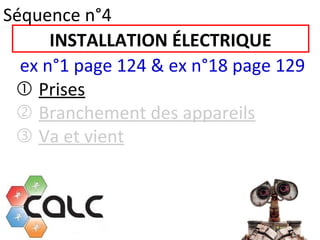 Le document traite des installations électriques, en soulignant les dangers liés aux prises et à leur câblage, notamment la distinction entre les bornes phase et neutre qui peuvent être dangereuses. Il aborde également le branchement des appareils en dérivation et l'importance de câbles de plus gros diamètre pour supporter l'intensité électrique. Enfin, il explique le fonctionnement des interrupteurs va et vient, recommandant l'utilisation d'interrupteurs spéciaux appelés inverseurs dans certains contextes.