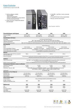 Les onduleurs Eaton Evolution 650/850/1150/1550 offrent une protection de haute densité pour équipements réseaux avec une topologie line-interactive et une autonomie optimisée, grâce à des fonctionnalités comme le délestage et le reboot distant. Ils garantissent la continuité de service avec des batteries remplaçables à chaud et une supervision complète via des logiciels Eaton. Disponibles en formats tour ou rack, ces onduleurs intègrent des ports de communication variés et sont certifiés pour répondre à des normes de sécurité élevées.
