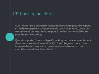 L'e-banking au Maroc est devenu essentiel pour les banques afin de maintenir leur compétitivité et répondre aux besoins des clients, facilitant ainsi la gestion des comptes en ligne. Bien que certaines banques offrent des services variés depuis les années 2000, l'utilisation reste limitée en raison des préoccupations concernant la sécurité et la confiance. Les banques doivent surmonter ces freins pour encourager l'adoption de l'e-banking par la clientèle marocaine.