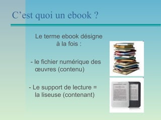 Le document présente une vue d'ensemble des ebooks, incluant leur définition, historique et formats compatibles pour la lecture. Il aborde également les avantages des liseuses et des tablettes, ainsi que les options de contenu gratuit et payant disponibles pour les lecteurs. Enfin, il mentionne des ressources pour gérer des bibliothèques d'ebooks et des fournisseurs de contenu numérique.