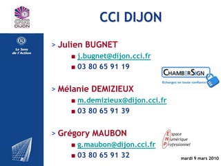 Le document fournit des informations pratiques sur l'utilisation de la plateforme e-Bourgogne pour les entreprises, y compris la création de comptes, la gestion des alertes, et la participation aux appels d'offres publics. Il mentionne également des ateliers organisés par la CCI de Dijon pour former les utilisateurs sur divers sujets liés aux déclarations sociales et à la dématérialisation. Les contacts et l'assistance sont également fournis pour aider les utilisateurs à naviguer sur la plateforme.