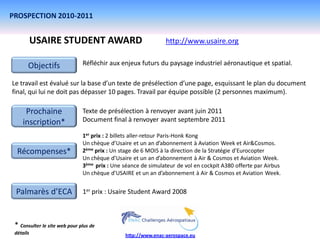 Le document présente divers concours destinés aux étudiants dans le domaine de l'aéronautique et de l'espace pour l'année 2010-2011, incluant des détails sur l'inscription, les objectifs et les récompenses. Parmi les concours mentionnés figurent le USaire Student Award, le défi aérospatial étudiant et le FAA Design Airport Competition, chacun offrant des prix variés et des opportunités d'apprentissage. Les informations comprennent également des liens vers des sites web pour des précisions supplémentaires et des délais d'inscription.