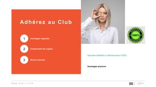 Le document présente le programme Excellence Club Ambassadors, qui permet de protéger et de faire fructifier son capital via des stratégies de trading en cryptomonnaies. Les membres peuvent bénéficier de bonus mensuels et d'avantages premium, tout en garantissant la sécurité de leurs fonds grâce à une diversification. Plusieurs packs de services sont disponibles avec différentes options de paiement pour adhérer au programme.
