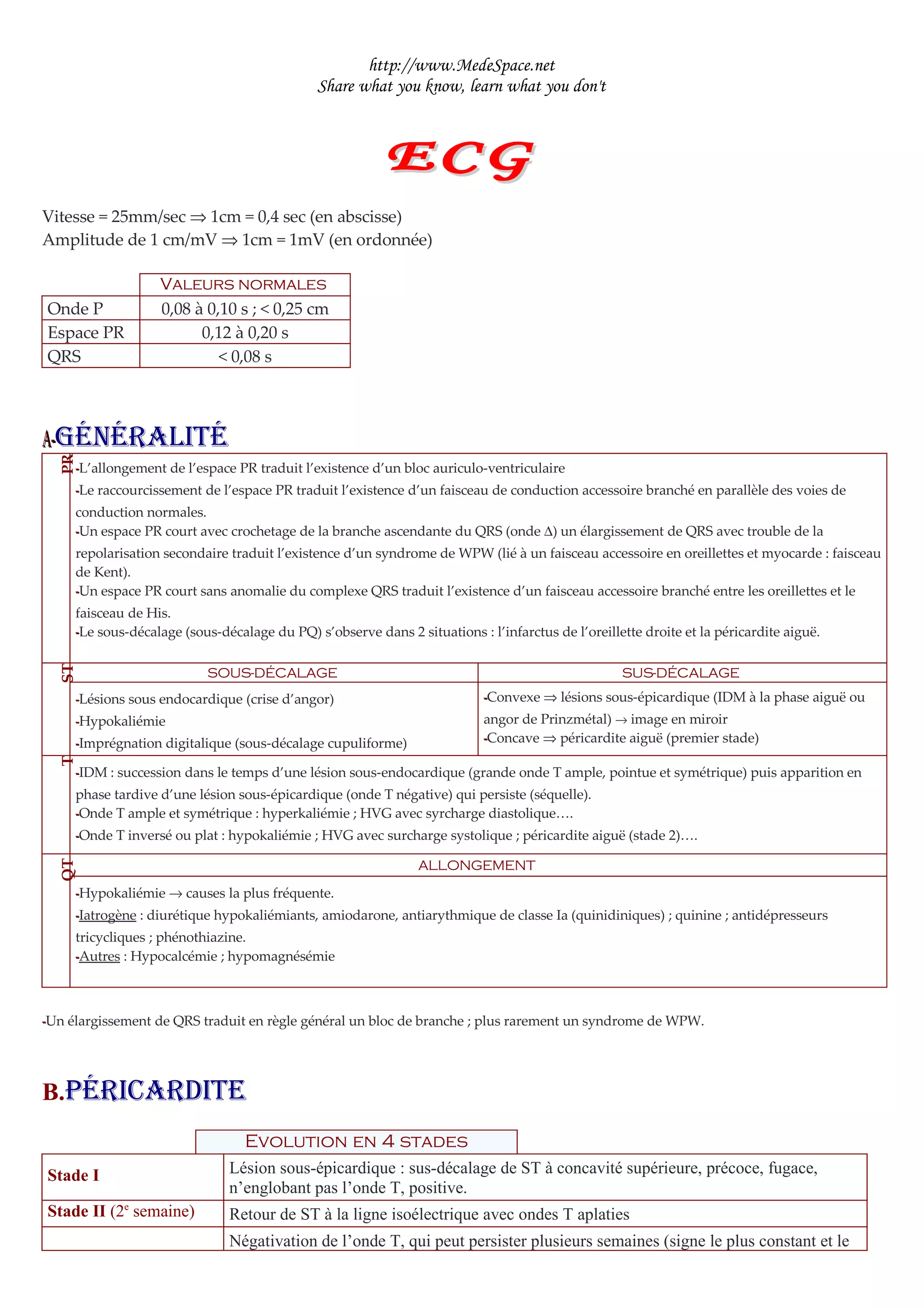 Le document traite des anomalies cardiaques, notamment des espacements du PQ, des complexes QRS et des intervalles QT, ainsi que des formations d'ondes spécifiques liées à diverses pathologies comme l'infarctus du myocarde et les troubles ioniques. Il explique également les différents types de blocs auriculo-ventriculaires et les caractéristiques électrocardiographiques qui en découlent. Enfin, il évoque certaines implications thérapeutiques des médicaments sur l'électrocardiogramme.