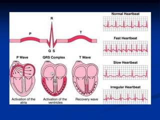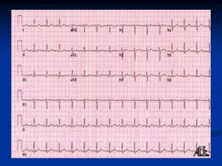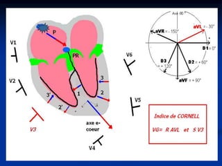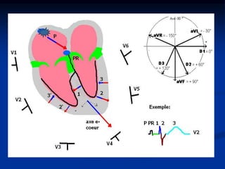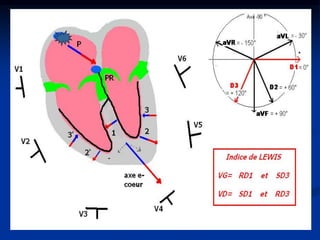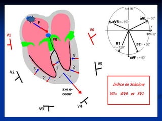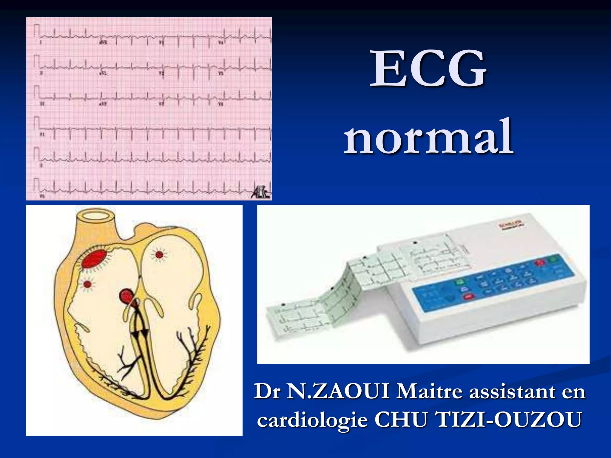 Le document présente les bases de l'électrocardiogramme (ECG), incluant ses principes d'enregistrement, les phases de dépolarisation et repolarisation, et les critères d'interprétation d'un ECG normal. Il aborde également les valeurs normales pour les différentes ondes et segments de l'ECG ainsi que des exemples de conclusions sur un ECG normal. En fin de document, un cas pratique d'ECG est analysé pour conclure à sa normalité.