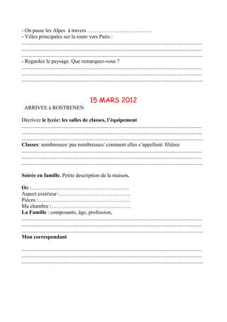 Le document décrit un échange scolaire entre la Bretagne et l'Émilie-Romagne, se déroulant du 14 au 20 mars 2012. Il présente le programme des activités de chaque jour, y compris les visites scolaires, les excursions et les interactions familiales. Les participants sont invités à noter leurs expériences et observations sur le voyage, les lieux visités et la vie au lycée en France.