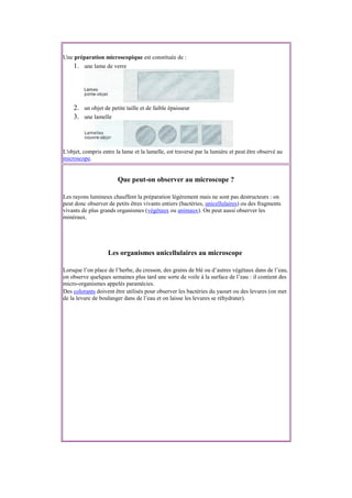 Le document décrit la préparation et l'observation microscopique d'échantillons, y compris des organismes vivants, des fragments de végétaux et des minéraux. Il explique les méthodes adéquates pour réaliser des préparations, ainsi que l'utilisation de divers colorants pour mieux visualiser les structures biologiques. Des conseils pratiques pour l'observation au microscope et des techniques de coloration spécifiques sont également fournis.