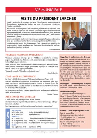 Le Petit Echo d'Orgerus d'octobre 2016 décrit les activités de rentrée scolaire, notamment l'intégration de nouveaux enseignants et intervenants, ainsi que de nouvelles initiatives périscolaires. Le document mentionne également diverses activités municipales à venir, telles que le Téléthon et la foire à tout, et met en avant les efforts pour sensibiliser les enfants à l'éducation alimentaire. Enfin, il rappelle des informations pratiques sur le stationnement et les transports en commun pour la commune.