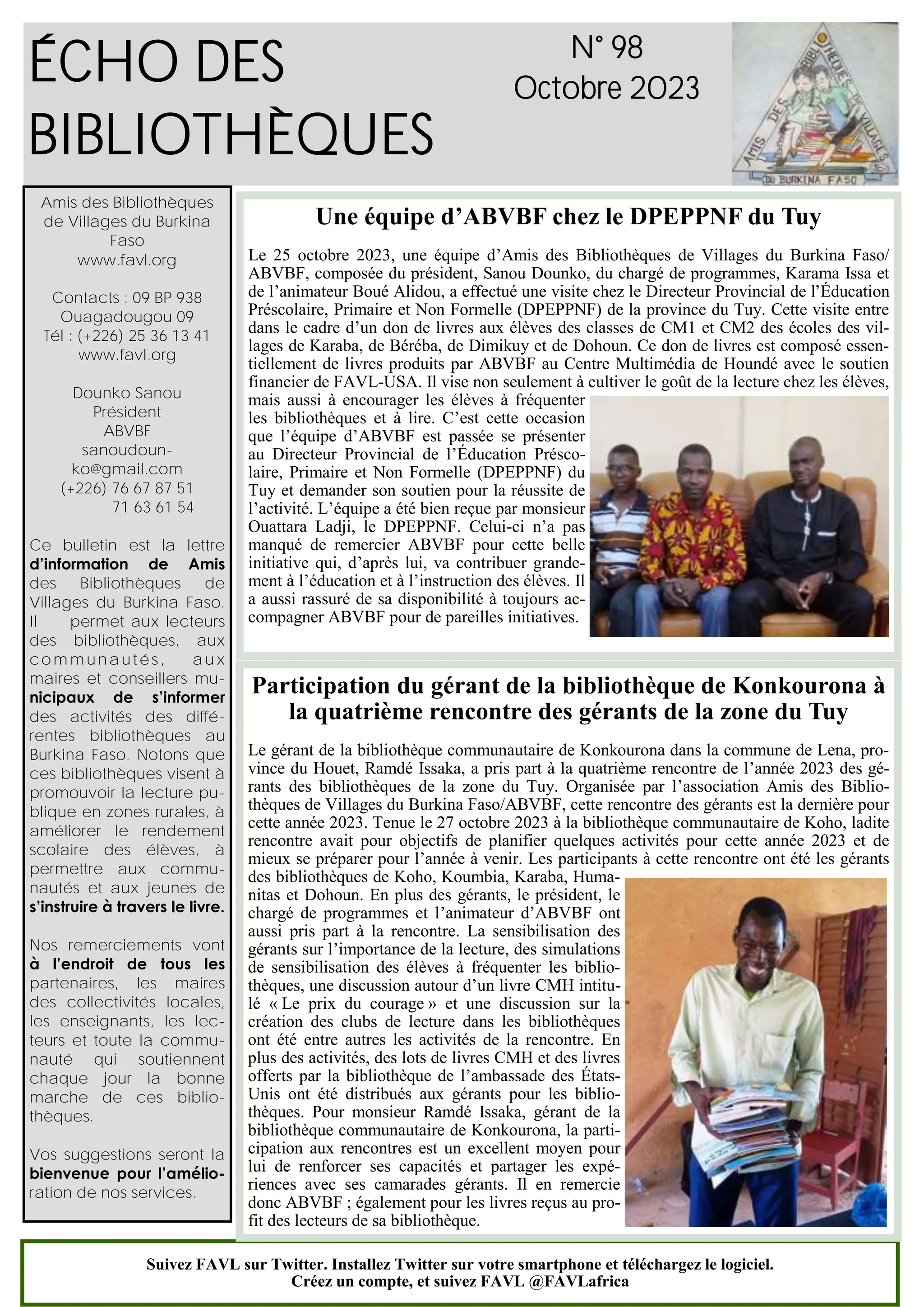 Le bulletin des amis des bibliothèques de villages du Burkina Faso annonce diverses activités pour promouvoir la lecture et soutenir l'éducation en zones rurales, incluant des dons de livres aux élèves et des rencontres entre gérants de bibliothèques. Des événements récents ont impliqué des séances de sensibilisation à la lecture pour les élèves et des discussions autour de livres culturels africains. Malgré des défis, l'engagement envers la lecture reste fort parmi les communautés, avec des fréquentations élevées dans les bibliothèques.