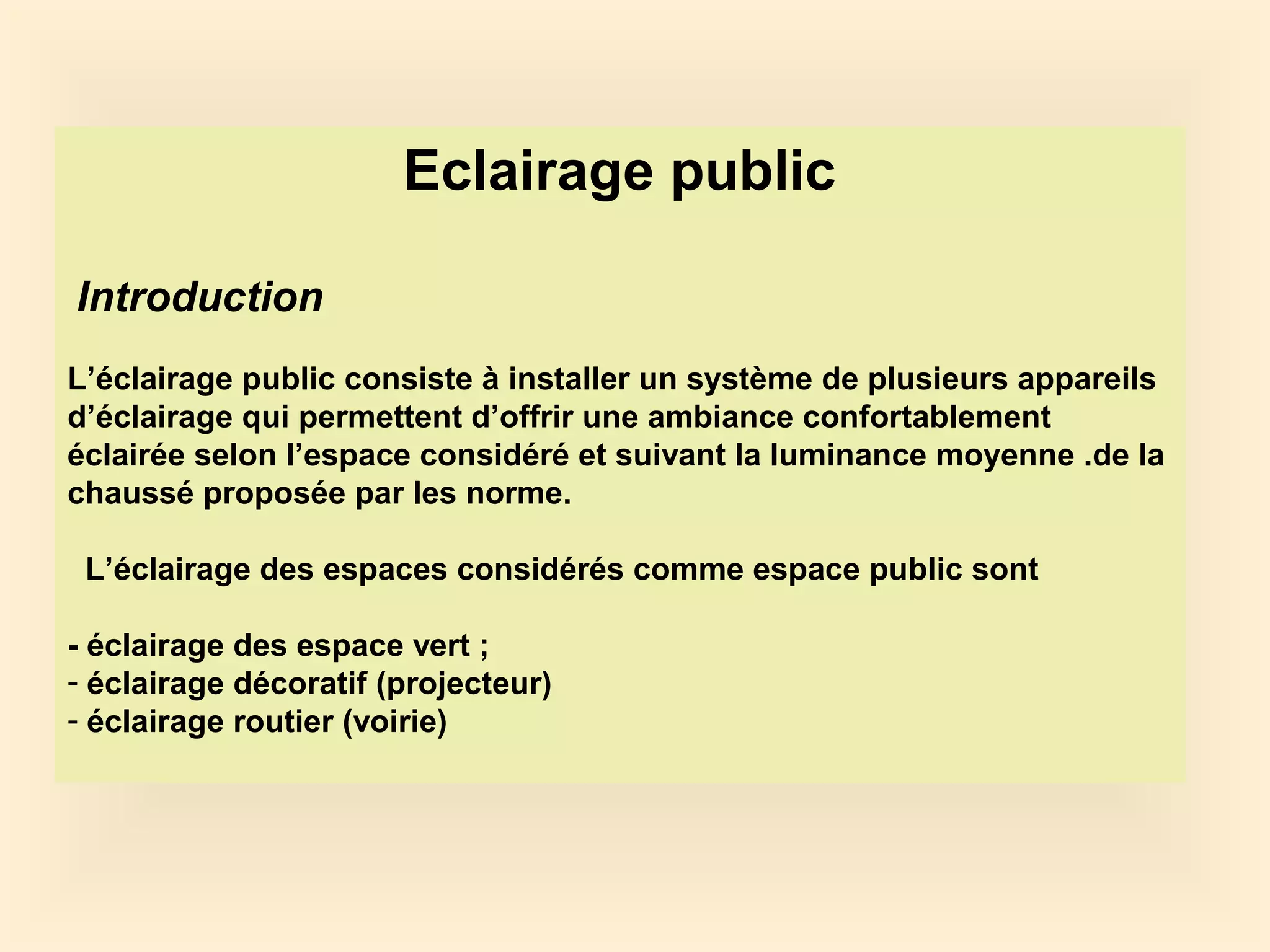 Le document traite de l'éclairage public, en détaillant les types d'éclairage, les méthodes de calcul nécessaires pour déterminer le flux de lampes, et les paramètres à considérer comme la hauteur des candélabres et l'espacement. Il présente également un exercice pratique pour calculer le nombre de candélabres requis sur un boulevard en fonction de divers facteurs tels que le type de revêtement et le facteur de vieillissement. Les différentes classes de voies de circulation et la luminance moyenne sont également abordées.