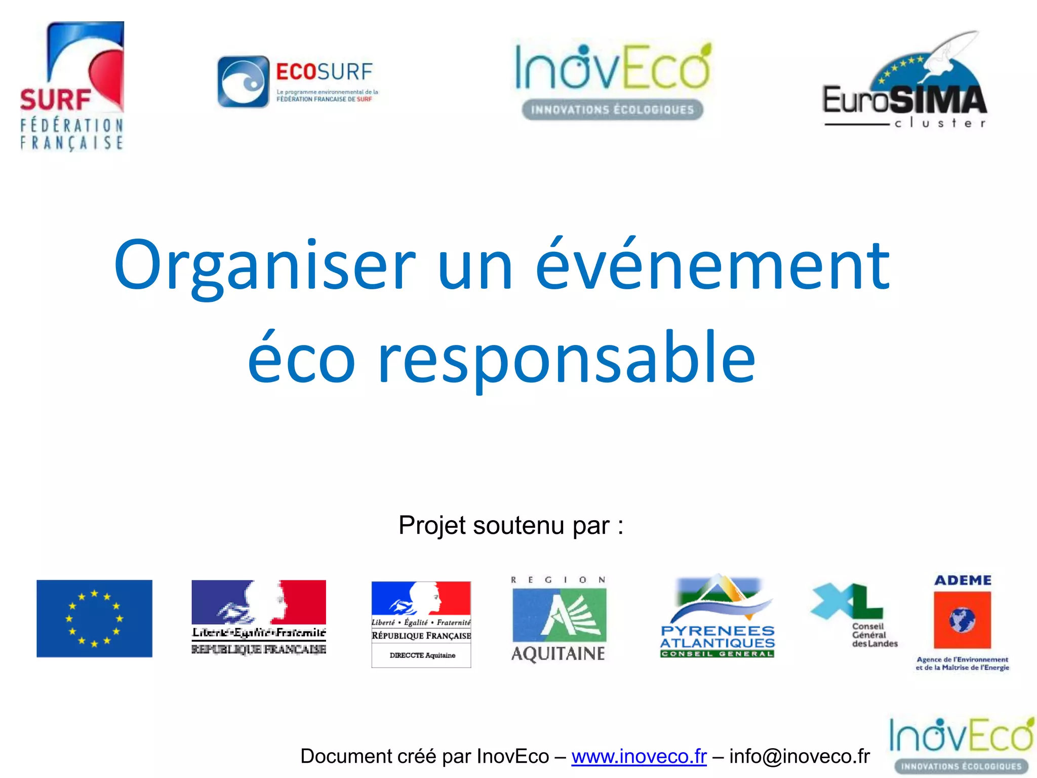 Le document présente un projet d'organisation d'événements éco-responsables soutenu par Inoveco, soulignant l'importance de réduire l'impact environnemental des manifestations. Il détaille la création d'un kit pour les organisateurs, ainsi que les méthodes et résultats de plusieurs événements pilotes, incluant la réduction de la consommation d'énergie et le tri des déchets. En outre, il propose des recommandations pour intégrer des critères environnementaux dans la planification d'événements futurs.
