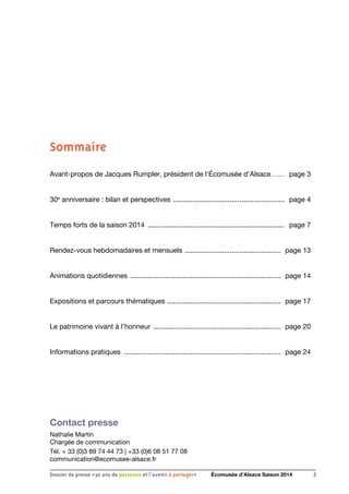 L'Écomusée d'Alsace célèbre son 30e anniversaire en 2014, mettant en avant son rôle dans la conservation du patrimoine alsacien et proposant diverses activités pour les visiteurs. Le musée, qui a ouvert en 1984, a évolué pour devenir un site vivant avec plus de 70 bâtiments et 40 000 objets, accueillant chaque année environ 180 000 visiteurs. Des projets pour l'avenir incluent l'inauguration d'espaces dédiés aux enfants et la création d'un quartier consacré à l'habitat traditionnel du futur.