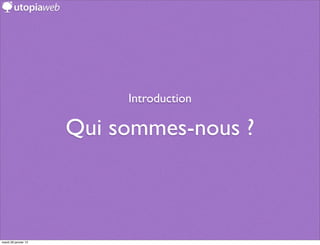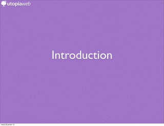 Utopiaweb, fondée par Simon André et Baptiste Placé, est une entreprise de services web active depuis 2008 et se concentre sur le SEO et le développement d'applications iOS. La conférence présentée aborde divers aspects du SEO, notamment l'optimisation in-page, in-site et off-site, ainsi que des approches éthiques différentes allant du white hat au black hat. Les participants apprendront à travers des sessions interactives, des quizz et des présentations sur l'historique et le fonctionnement des moteurs de recherche.